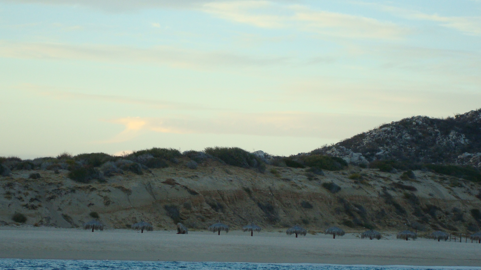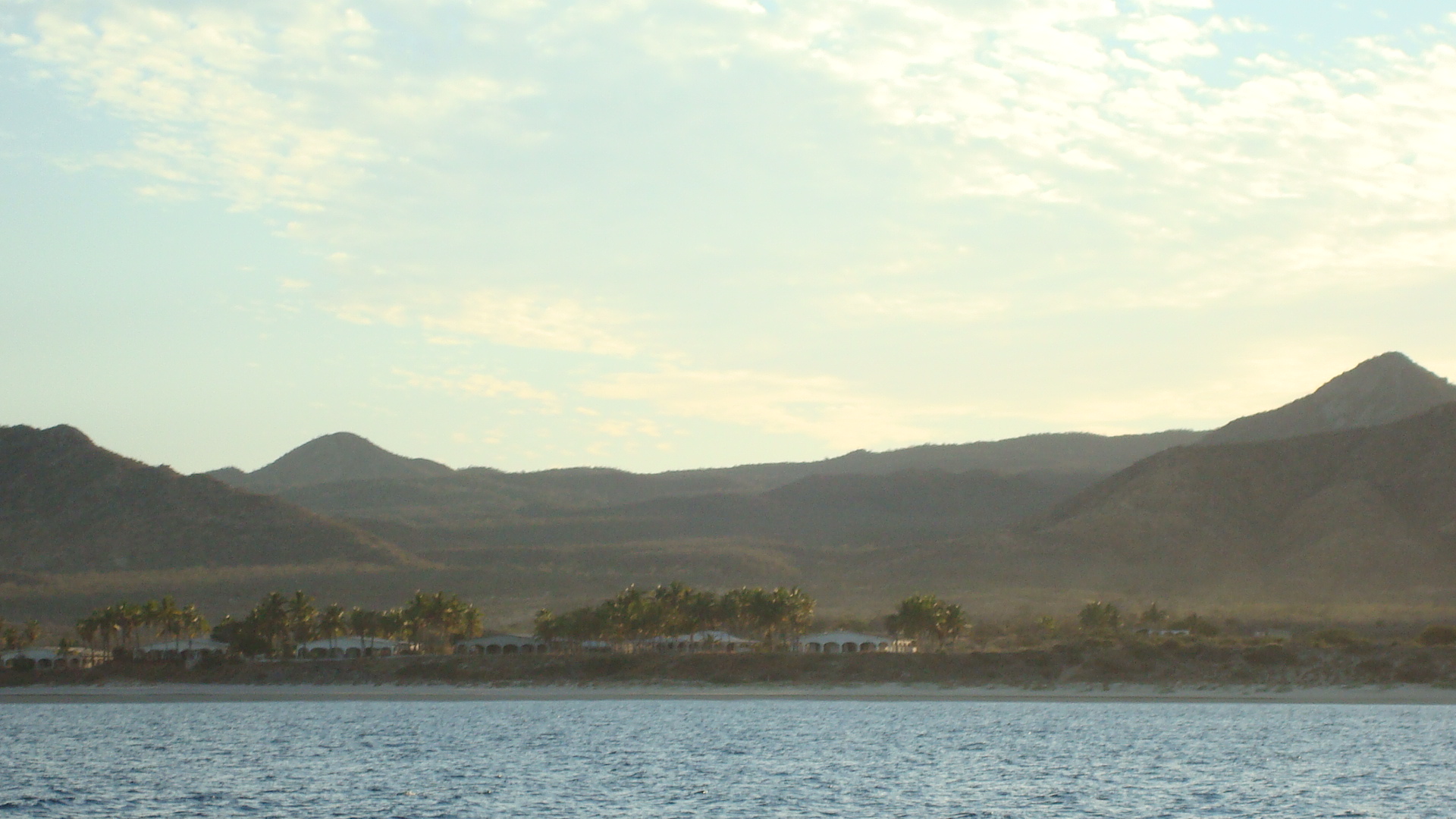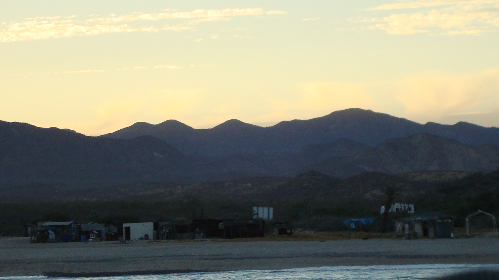 We arrived in Los Frailes delighted to find palm trees, mountains, manta rays flying out of the water, no noise, and a beautiful sunset. The beach is full of strangely ornamental cabana style umbrellas, as if they were put here for some hotel that was never built. On closer inspection, the Palapas, as they are called, are actually free, shaded camping spaces, each with a grill and table. Close by is a small fish camp with shacks and tents. Then there’s the drug lord house on a nearby hillside…A large and beautiful house with a helicopter parked out front.