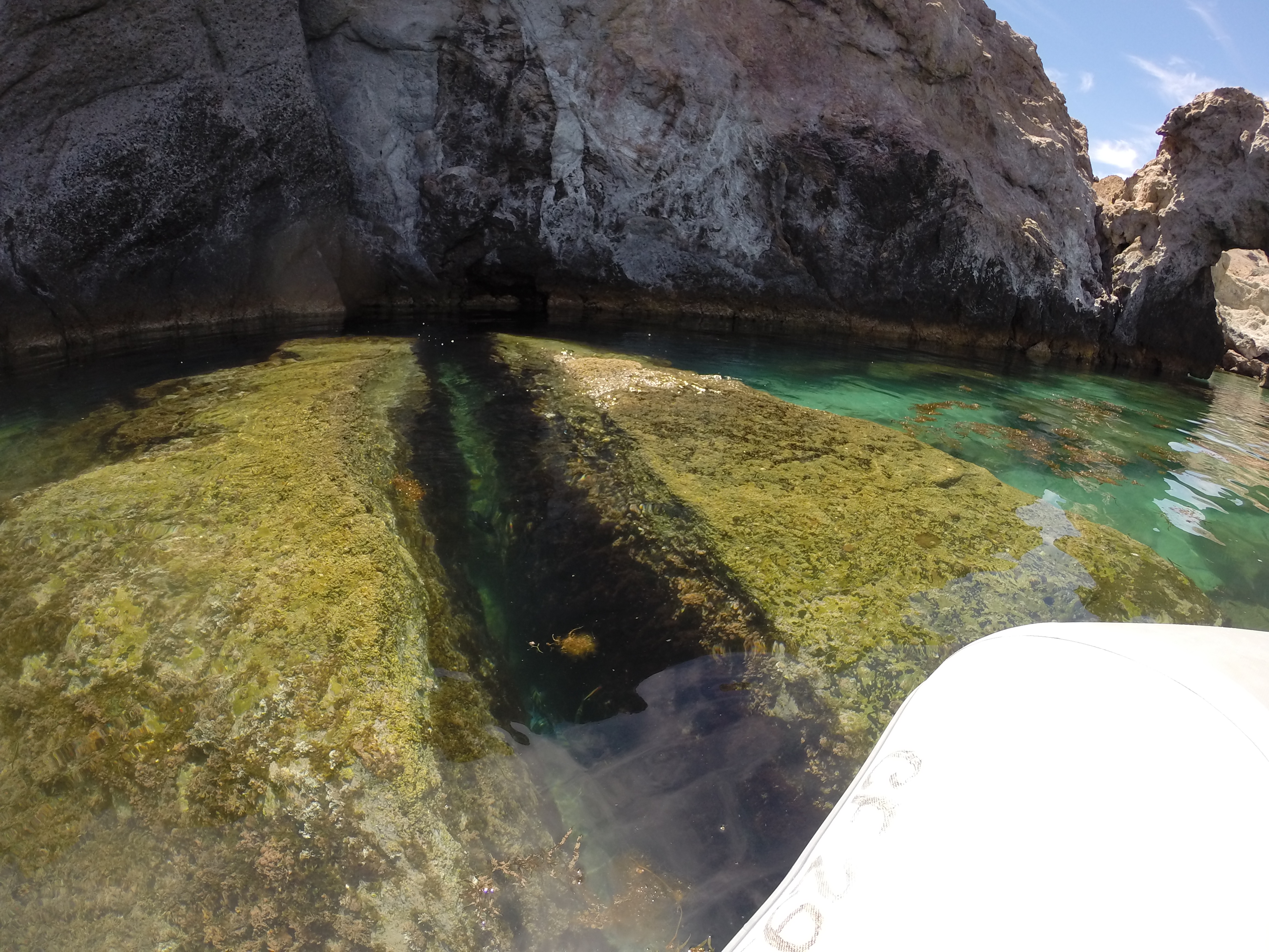 After leaving La Paz, we spent our first night anchored in Ensenada Grande at Isla Partida. It was a new first for us—-we earned our dinghy-painter-around-the-prop badge! We had been towing the dinghy, and I forgot to pull it in closer to the boat as we entered the anchorage. I dropped the anchor and Heather put the engine in reverse to back down and set the anchor, only this time there was a sudden klang and then silence as the tow rope was now wrapped tightly around our propeller. At the very least, it was a good excuse for me to go swimming 🙂
