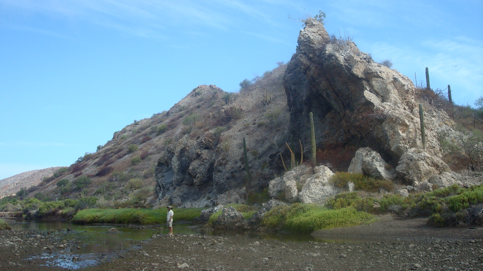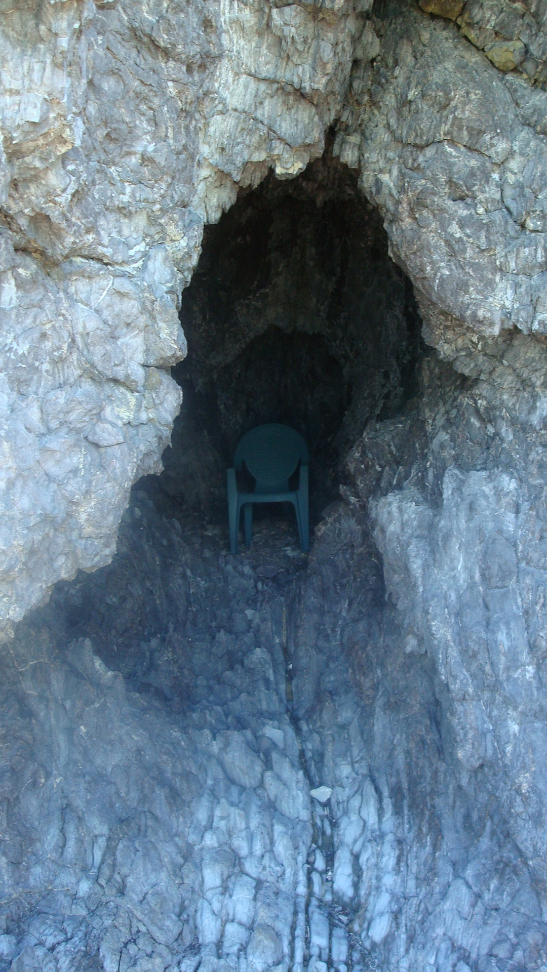Now at San Juanico we are anchored between two small, rocky islets. These strong afternoon thermal winds have kicked up quite a chop, and we’ve put off snorkeling until later this evening. We have already done a bit of hiking, though, and discovered a cave going back into one of the cliffs. I carefully worked my way inside watching the ceiling for bats and discovered—a green lawnchair. It did seem like a nice, cool place to escape the direct sun and read a book.