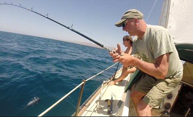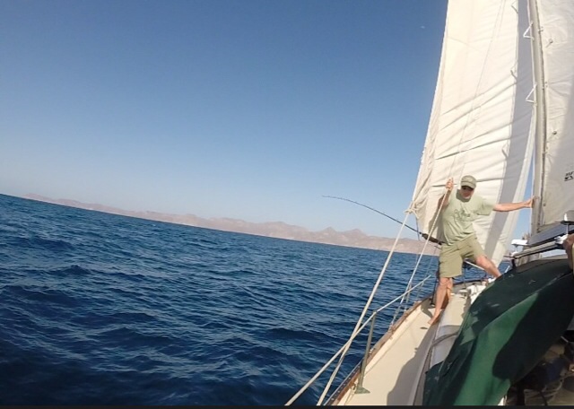 Fishing Report: we caught a skipjack on the handline yesterday, and this morning I caught a nice triggerfish with the speargun that we enjoyed breaded in riceflour as a taco lunch. They really do taste like lobster. We kept in touch with Mandolina via the SSB radio as they crossed over to Guaymas, and they radiod last night that they landed a 6ft. sailfish on a handline! Then they had mahimahi swimming in their bow wake throughout the night.